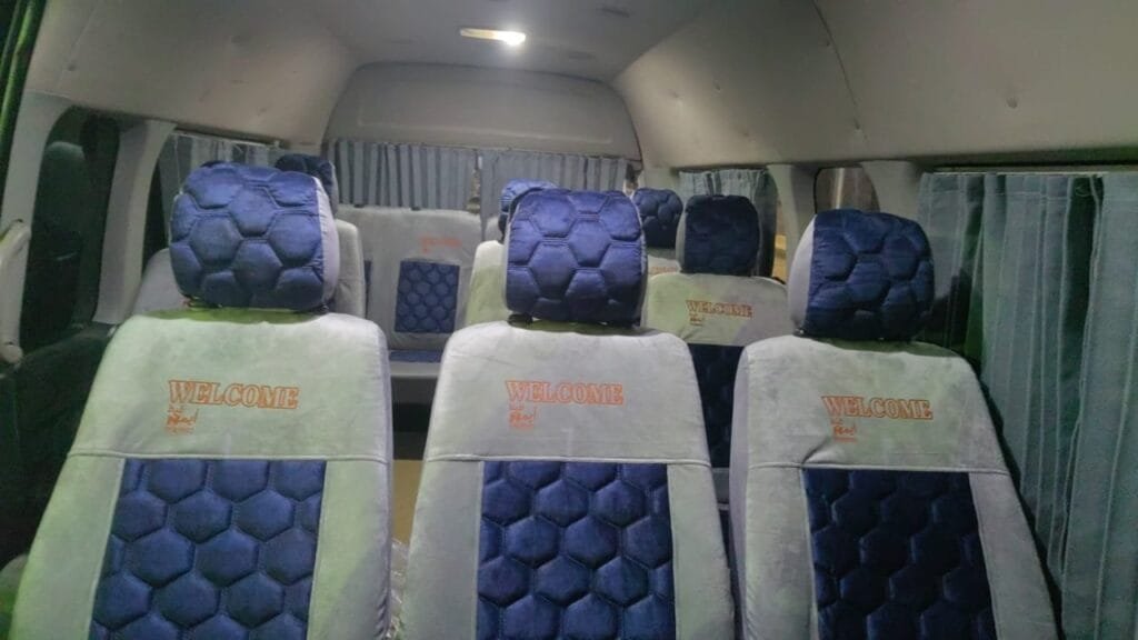 لذلك تأتي ميكروباصات 13 كرسيًا مجهزة بتكييف هواء، مما يوفر راحة إضافية خلال الرحلات الطويلة، خاصة في الطقس الحار. المقاعد مصممة لتكون مريحة، مما يتيح للركاب الاسترخاء والاستمتاع بالمناظر أثناء السفر.